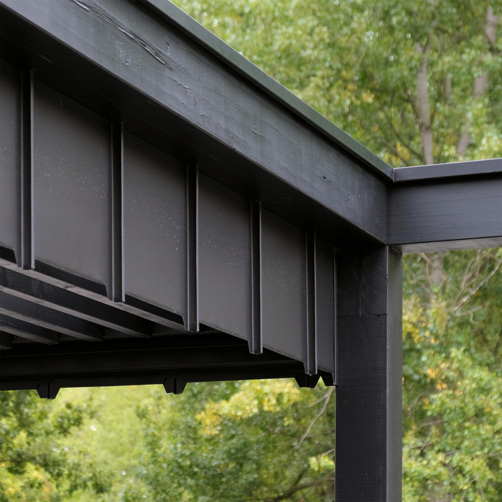 Nous avons livré l’aménagement extérieur de la maison à Sainghin-en-Mélantois. Un portique – conçu comme une installation paysagère – fabrique une limite articulant l’habitat avec son environnement. Il constitue une pièce à ciel ouvert d’un côté et structure le jardin de l’autre.